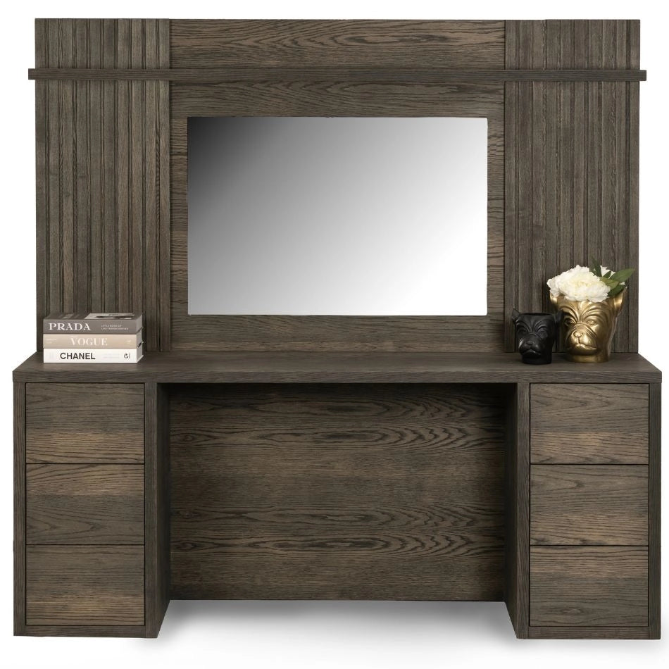 Discover the Hibberdene Dressing Table – a sleek and durable addition to your modern bedroom. Crafted with precision, this dressing table showcases a sophisticated ebony oak veneer and elegant solid oak slats. Its dimensions of 1800mm (length) x 1800mm (height) x 450mm (depth) fit seamlessly into your space. Enjoy 6 push-to-open drawers for organised storage. The built-in mirror adds charm and functionality to your daily routine.