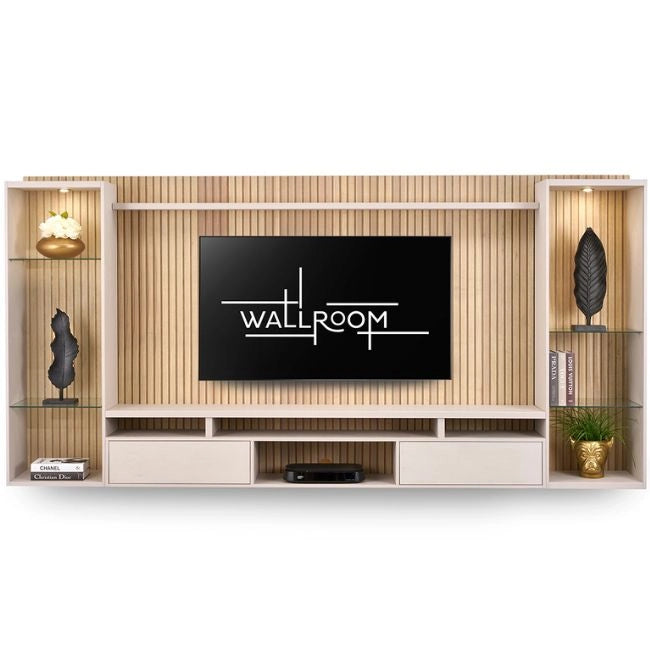 3Pce Floating TV Stand - Solid Oak Slats in Dark Mist & Cotton Stucco accents