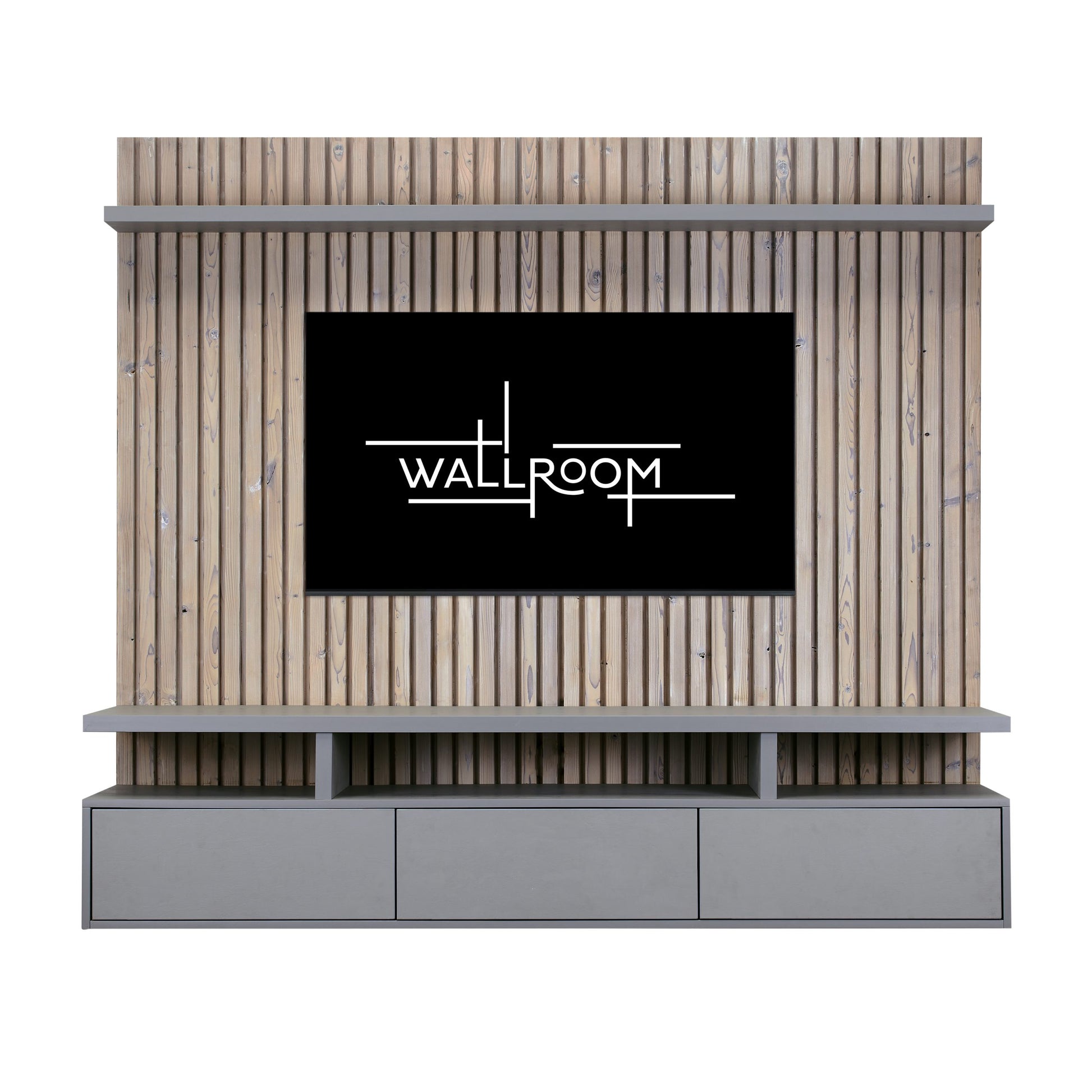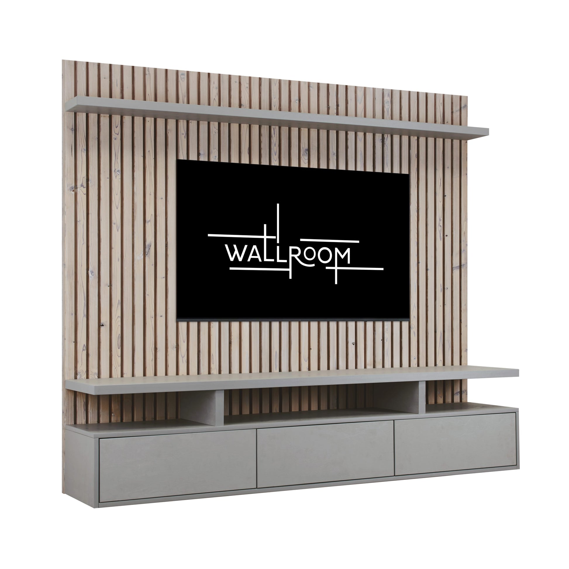 Floating TV Stand - Solid Wood Slatted Backboard in Cloud & Castle Grey Stucco accents