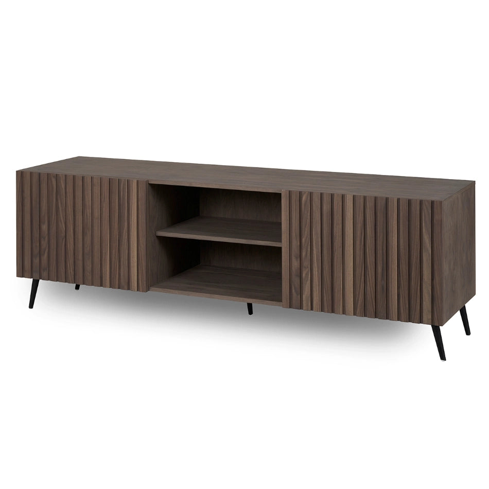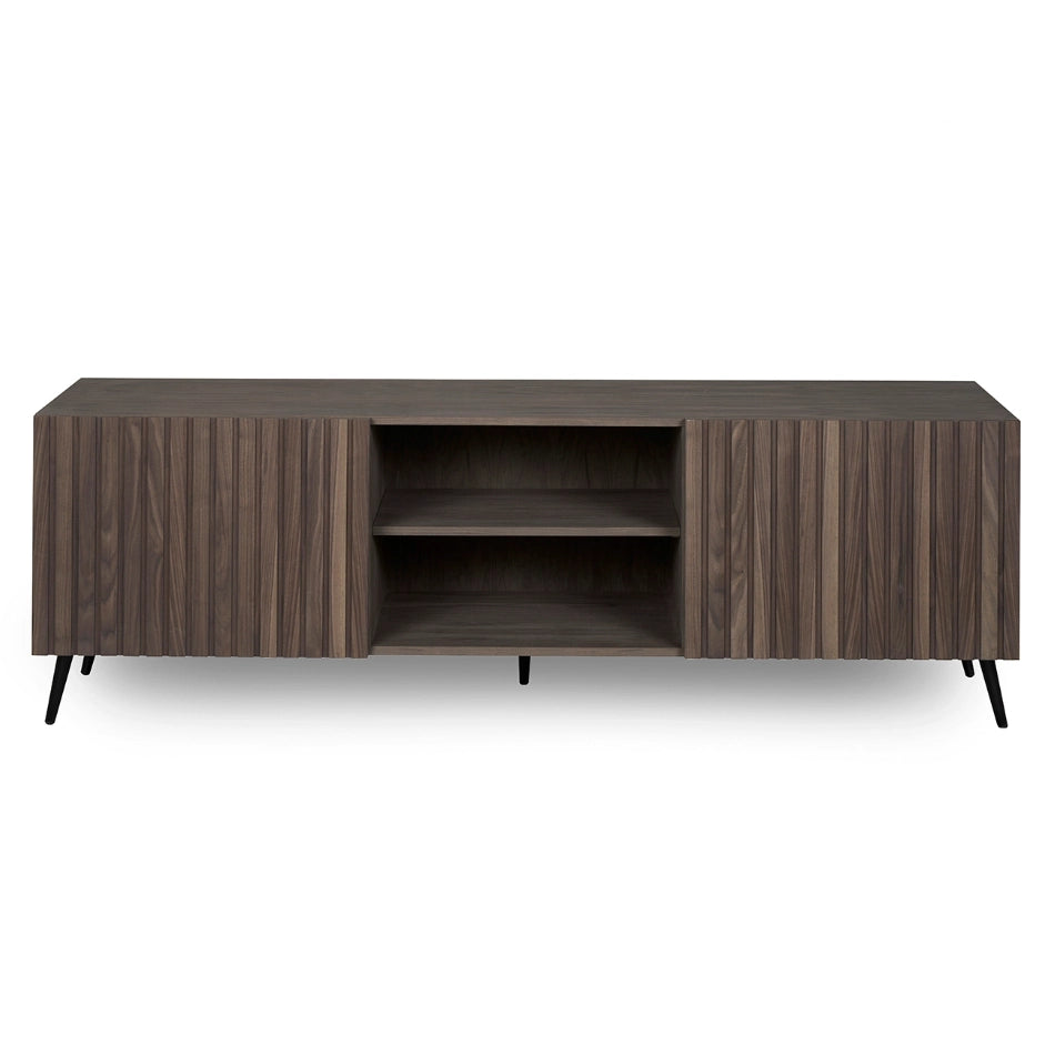 Revitalise your entertainment space with the luxurious Pennington TV stand in an American Walnut veneer finish. Offering ample storage with 2 pull-open doors, an open compartment for components, and elegant slatted wood detail, it brings a polished and minimalist touch to showcase your TV. Available in various sizes to perfectly fit your space.