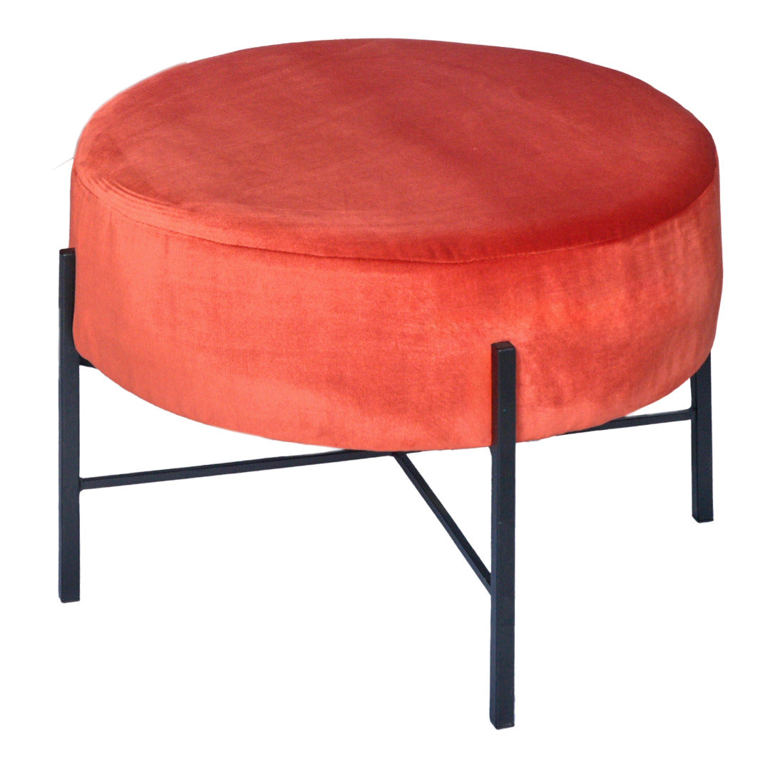 Our round ottoman features a steel frame base and soft burnt orange upholstered cushion. This stylish piece adds a pop of colour, serving as a footstool or extra seating, perfectly pairing with occasional chairs and nesting tables.