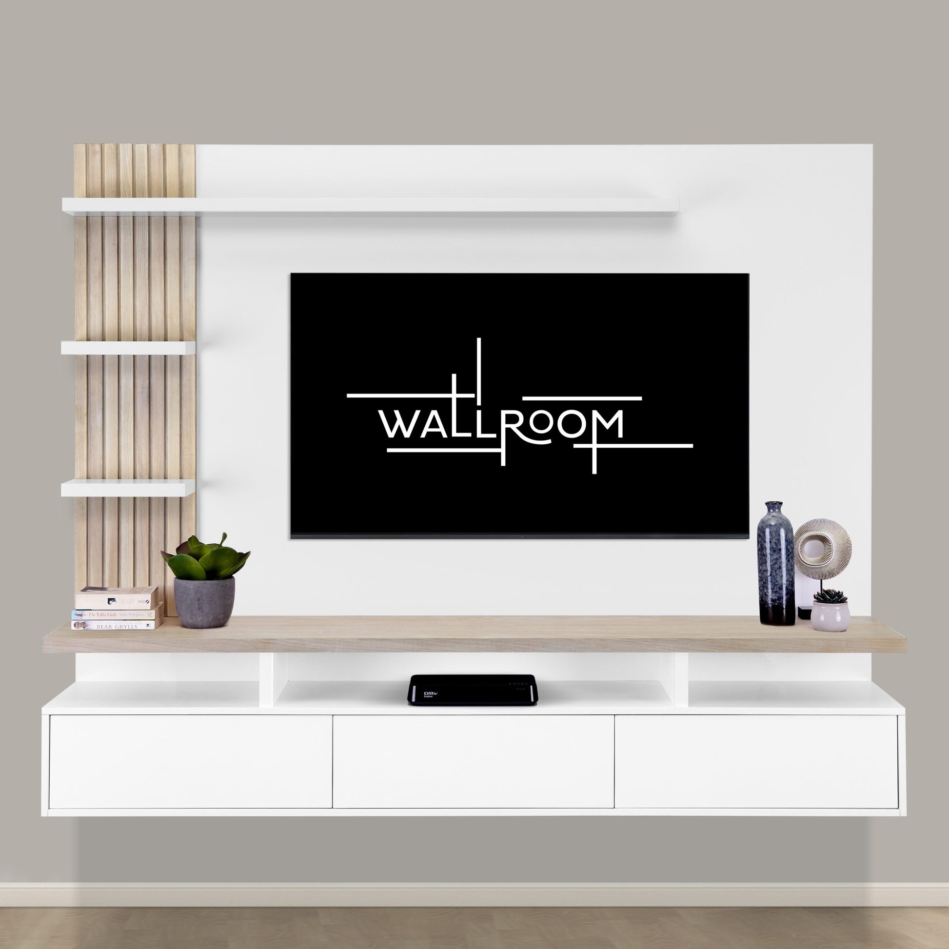 Wall Mounted TV Unit - Solid Oak Slats & Oak Veneer in White & White accents